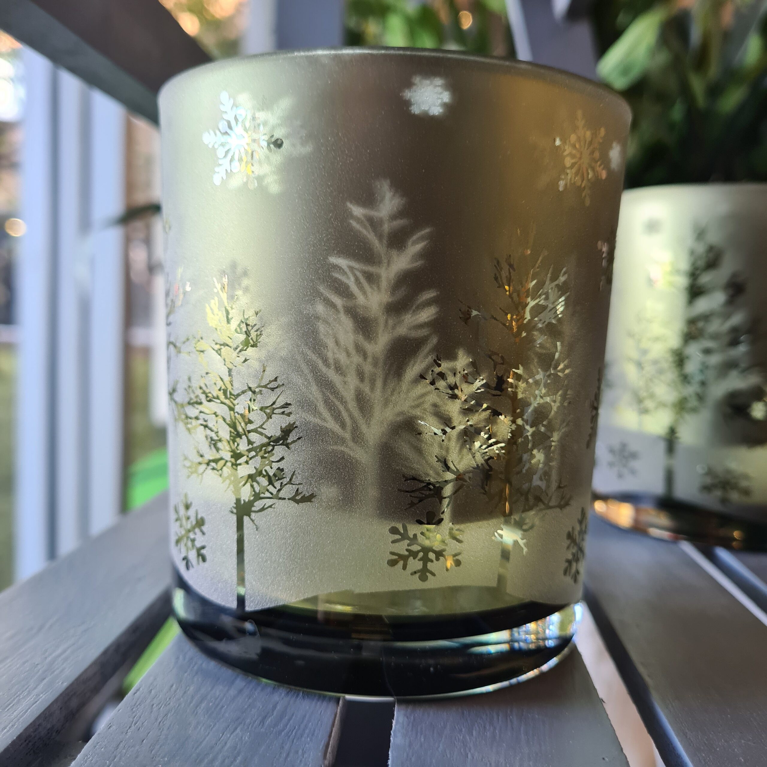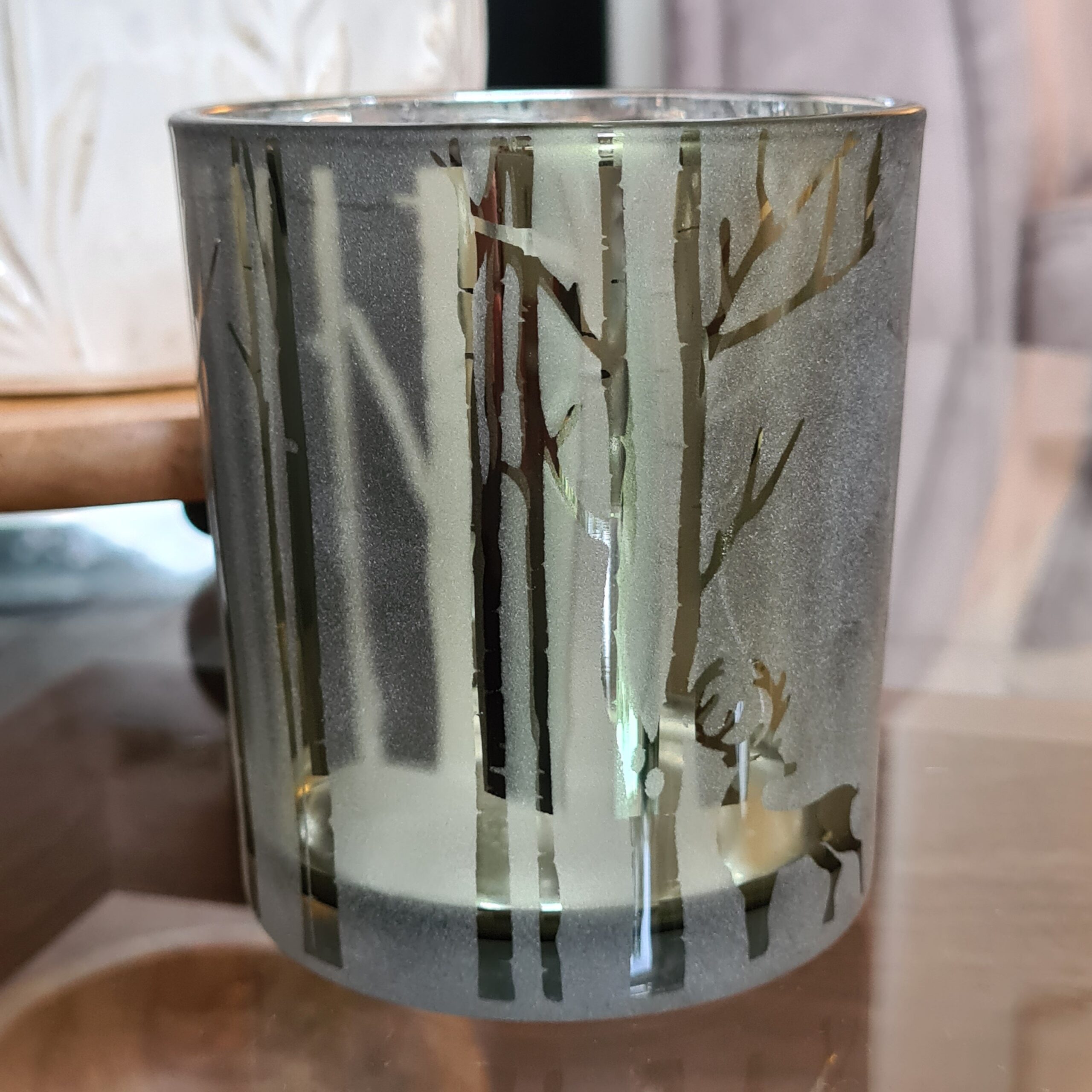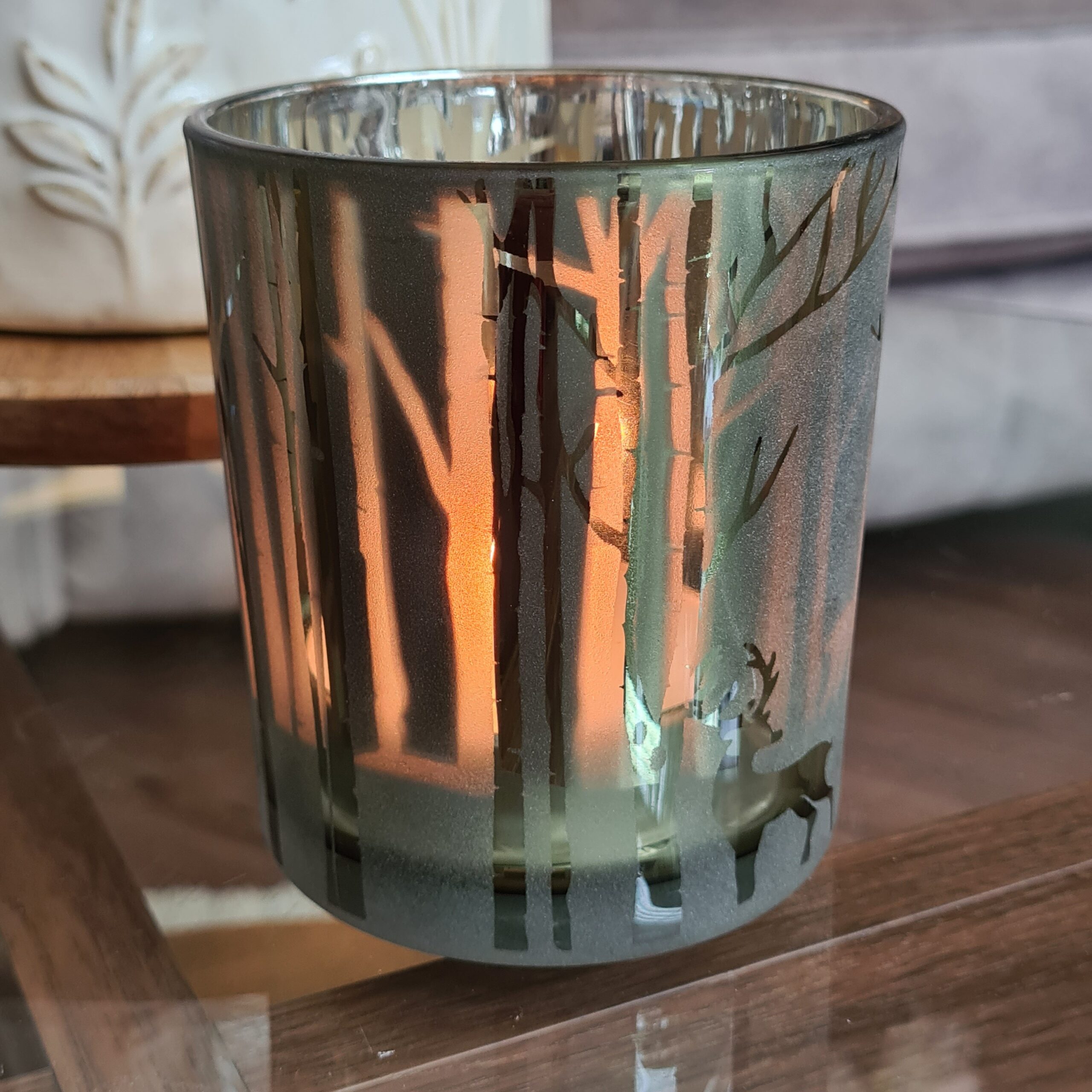 This glass candle holder in a forest green colour has a beautiful woodland stag or choose the gorgeous Woodland scene, which will allow the candlelight to dance through and illuminate your room with a cosy glow. Perfect!
