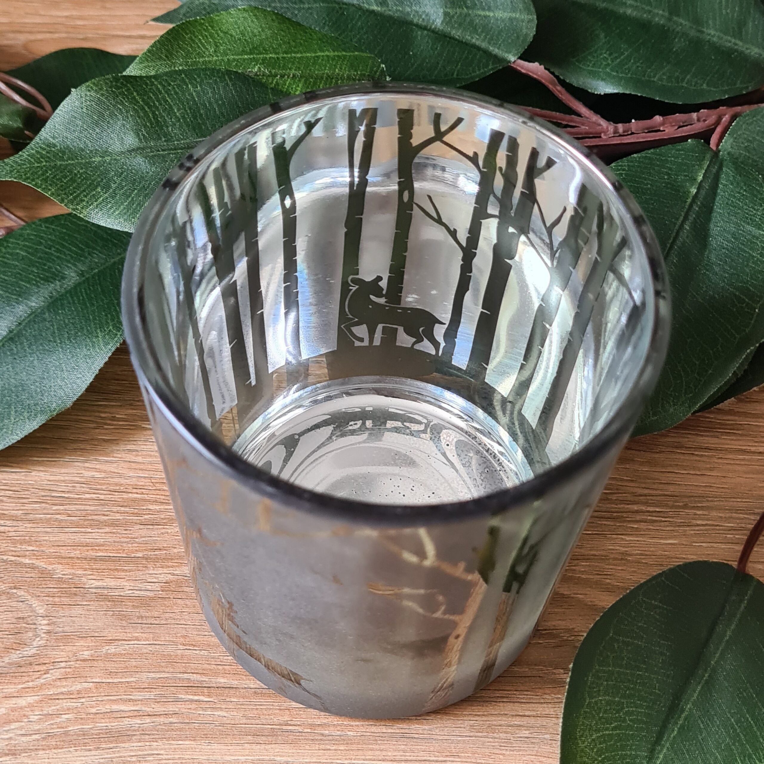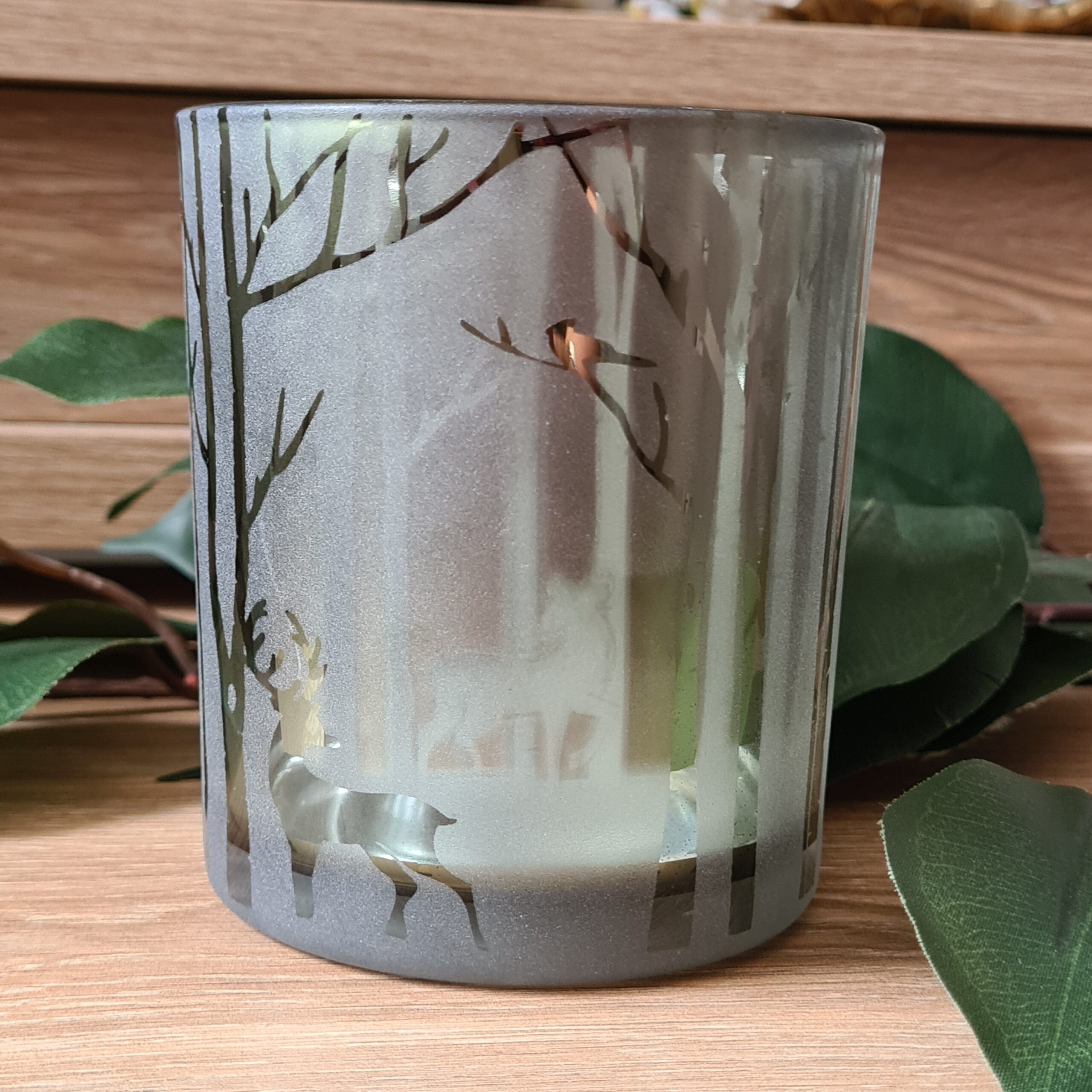 This glass candle holder in a forest green colour has a beautiful woodland stag scene