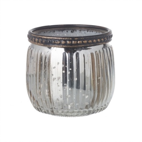 A beautiful ribbed glass votive with a dark grey exterior that allows the refective silver interior lighting to shine through.