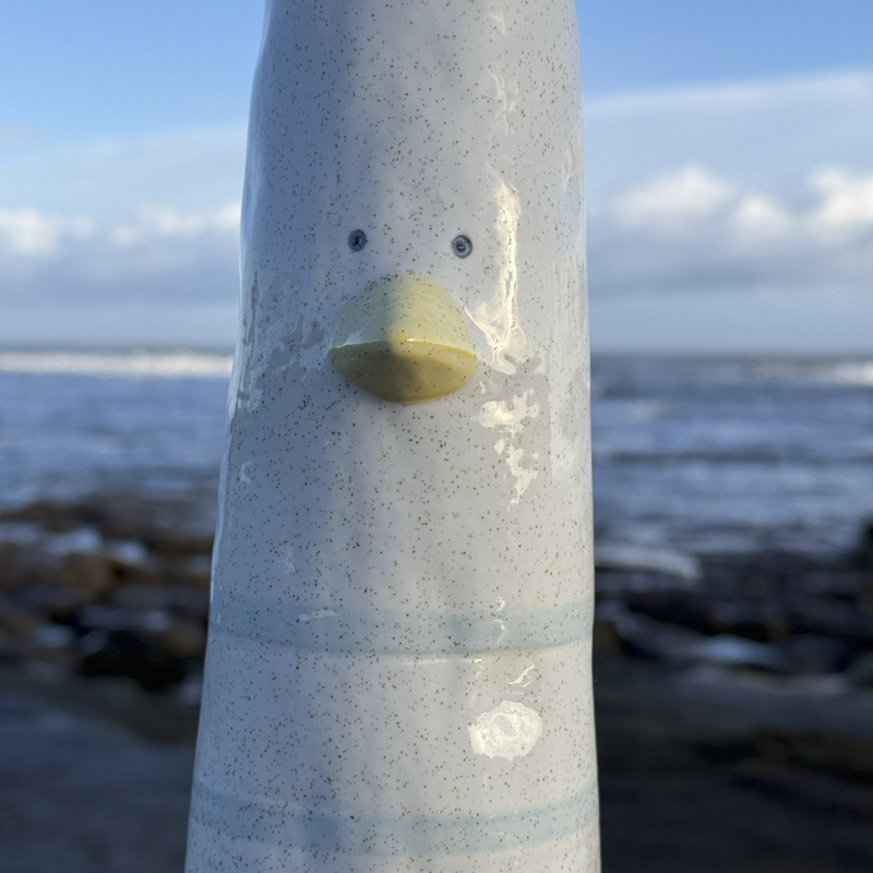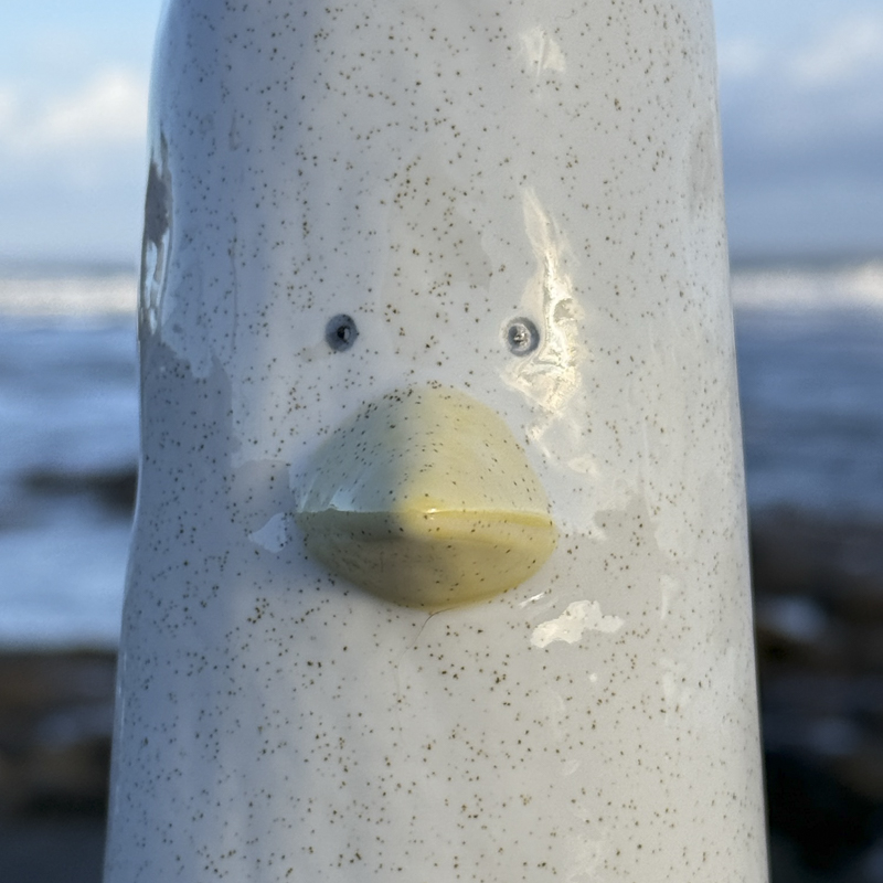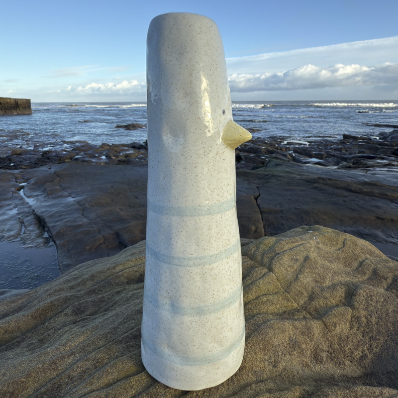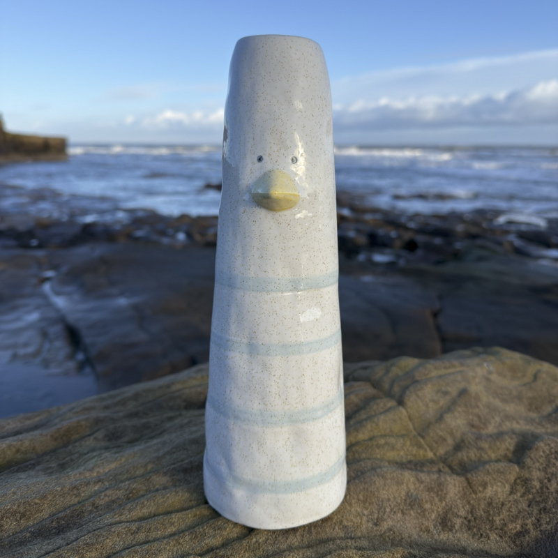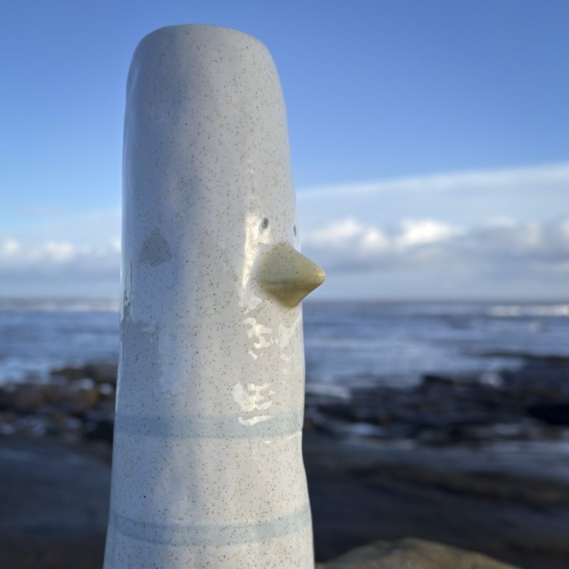 This charming pot showcases an adorable duck motif, bringing a playful charm to your indoor space. The design features a prominent duck bill and blue stripes around the lower portion. This design fits perfect for a coastal themed design.